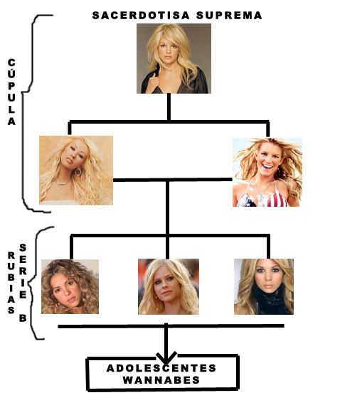 Por otro lado están las madres de estas criaturitas. La de Britney (que para eso ha estado con ella durante toda su carrera) se agenció, por supuesto con el consentimiento, la aprobación y la bendición de su hija, el puesto de Secretaria Mayor [Foto1]. Por debajo de ella y paralelamente a la estructura de La Secta se encuentran la madre de Christina y la madre de Jessica. Y continuando hacia abajo, al igual que en La Secta encontraríamos por orden a las madres de las Rubias Serie B y a las madres de las Adolescentes Wannabes.